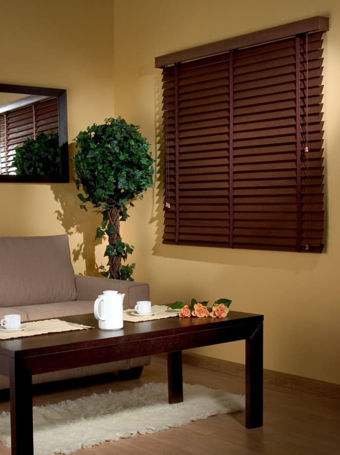Коричневые деревянные жалюзи универсальны и подходят для большинства интерьеров (от классических до современных), привносят в пространство теплоту и натуральность.